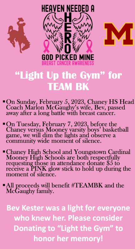 On Sunday, February 5, Chaney High School head basketball coach Marlon McGaughy's wife, Bev, passed away after a long battle with breast cancer. Before the Tuesday, February 7 Chaney VS Mooney game, we will dim the lights and observe a moment of silence.Pink glow sticks will be available to purchase for $5.00 to help "Light Up the Gym" in Bev's honor. Please consider donating in memory of Bev. JV/V 5:30/7:00 p.m.